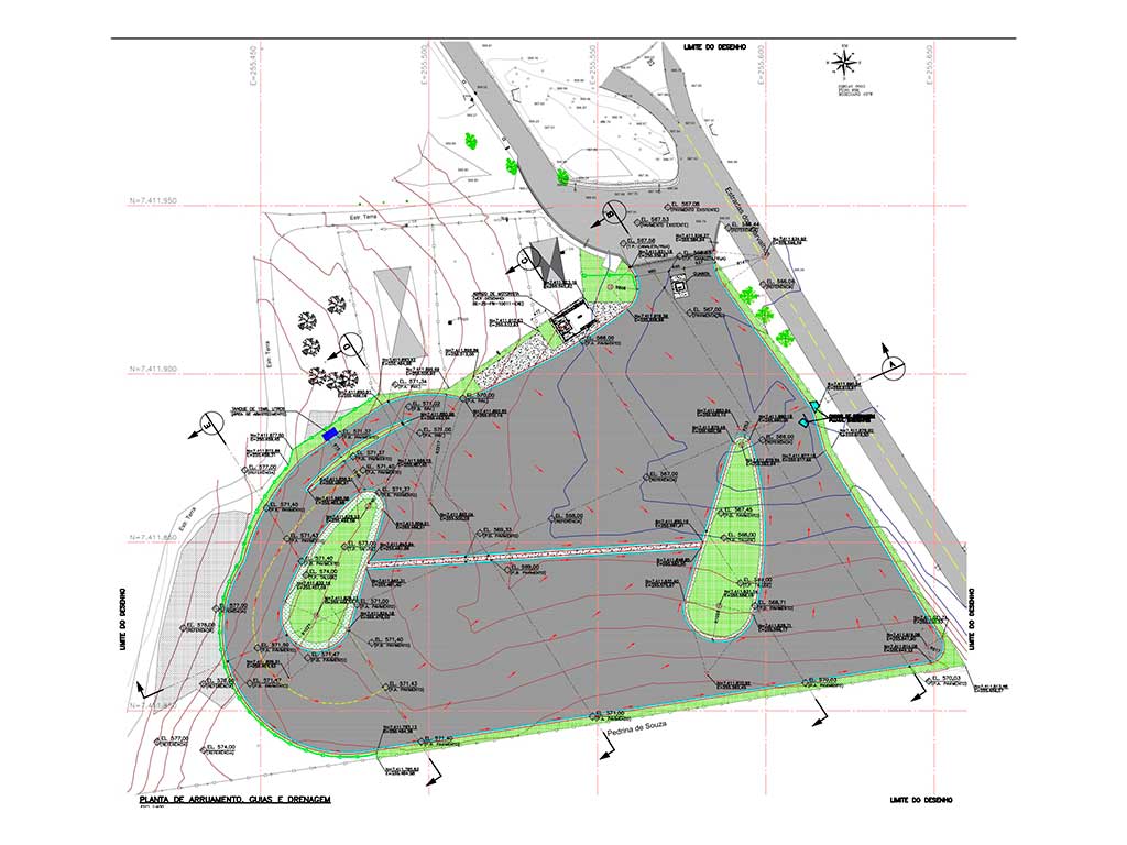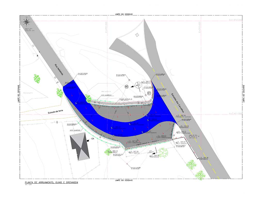 Projeto de drenagem para evitar alagamentos, erosões e degradação precoce.